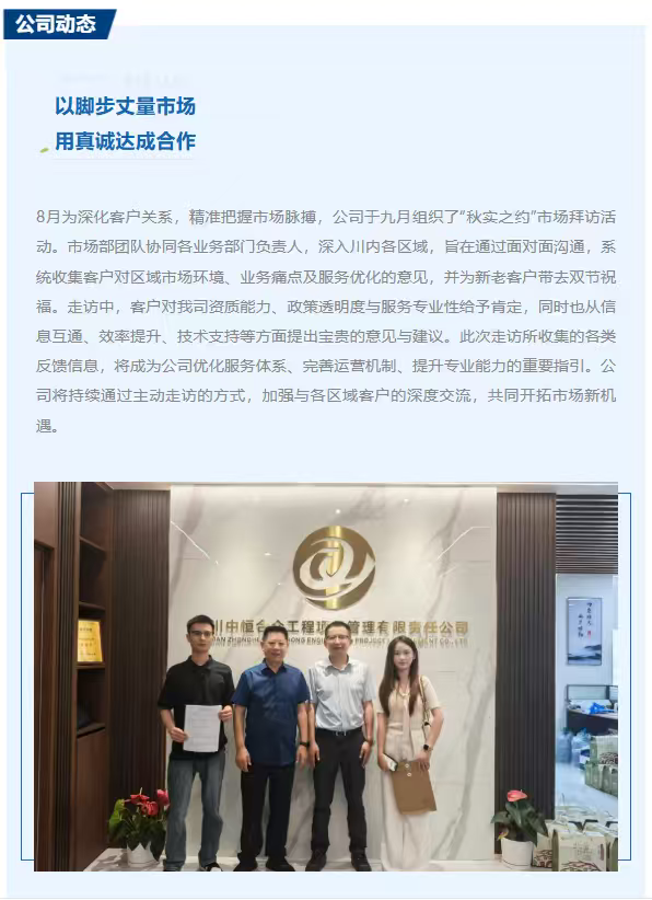 九月蜀地,金秋送爽。值此收获与展望之际,公司“秋实之约”川内客户专项走访行动正式启动。公司市场部协同各业务部门负责人组成专项团队,兵分五路,深入四川东西南北中各区域,与客户开展面对面交流。此次走访旨在深入一线,倾听最真实的市场声音,推动公司服务政策与客户需求精准对接,切实……