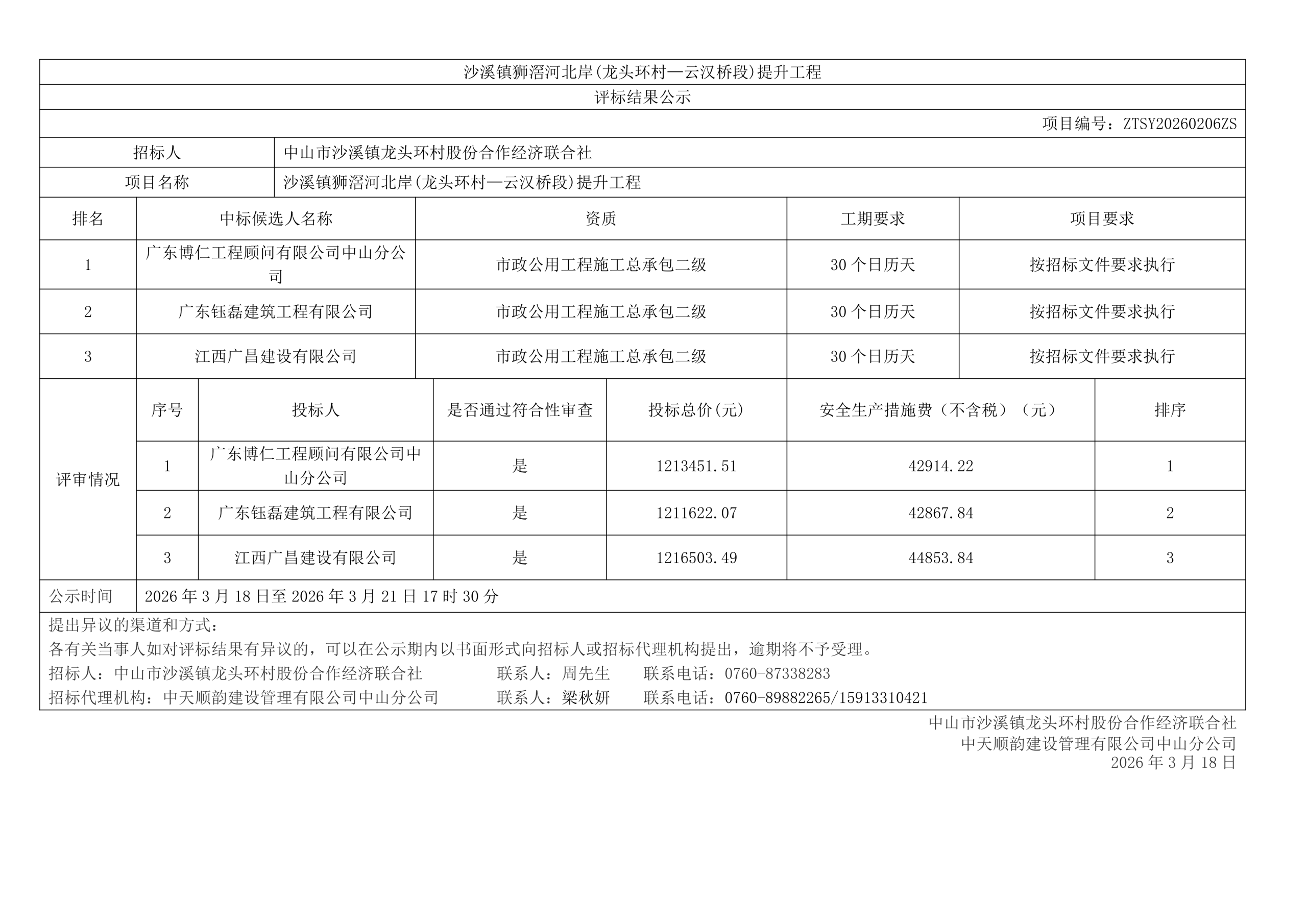 沙溪镇狮滘河北岸(龙头环村—云汉桥段)提升工程评标结果公示